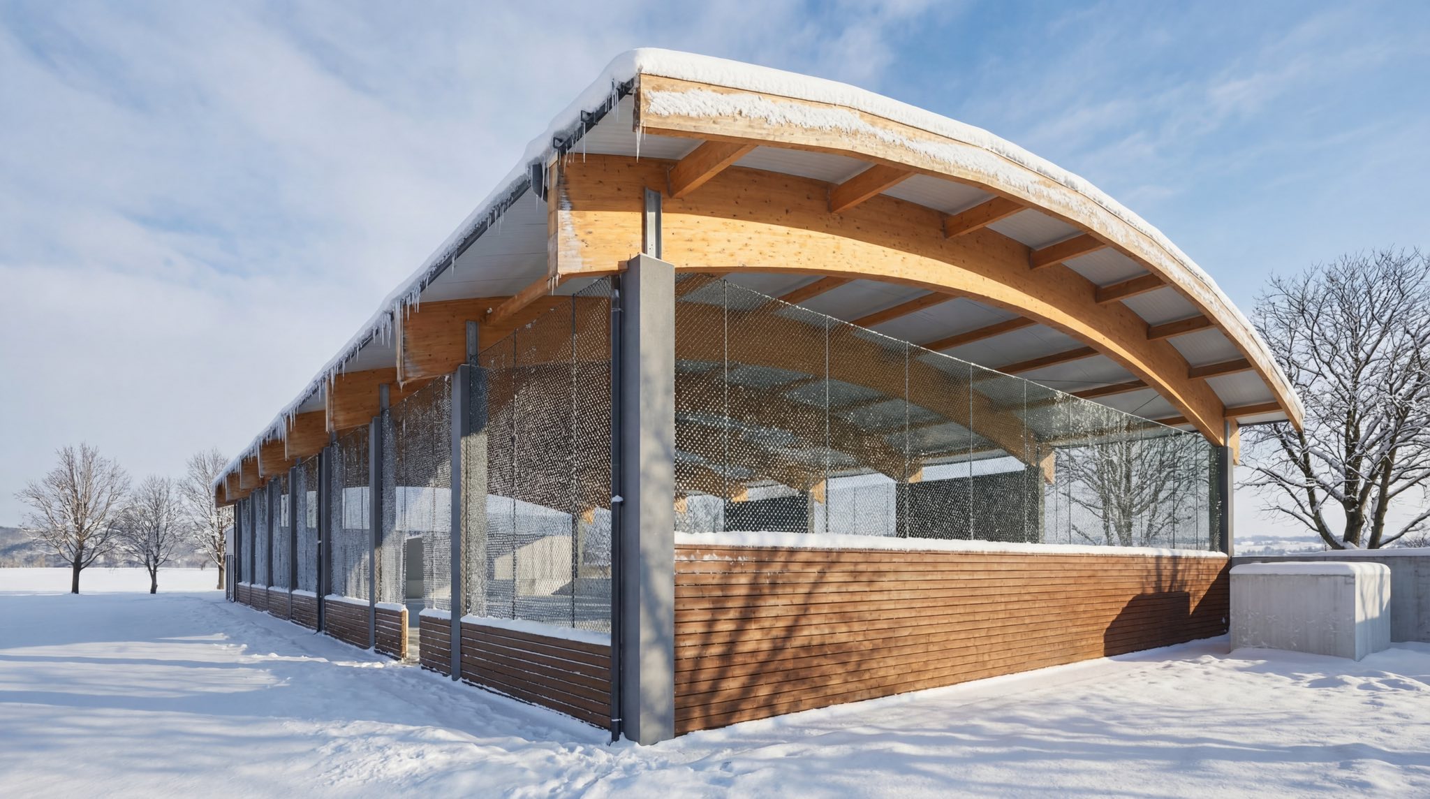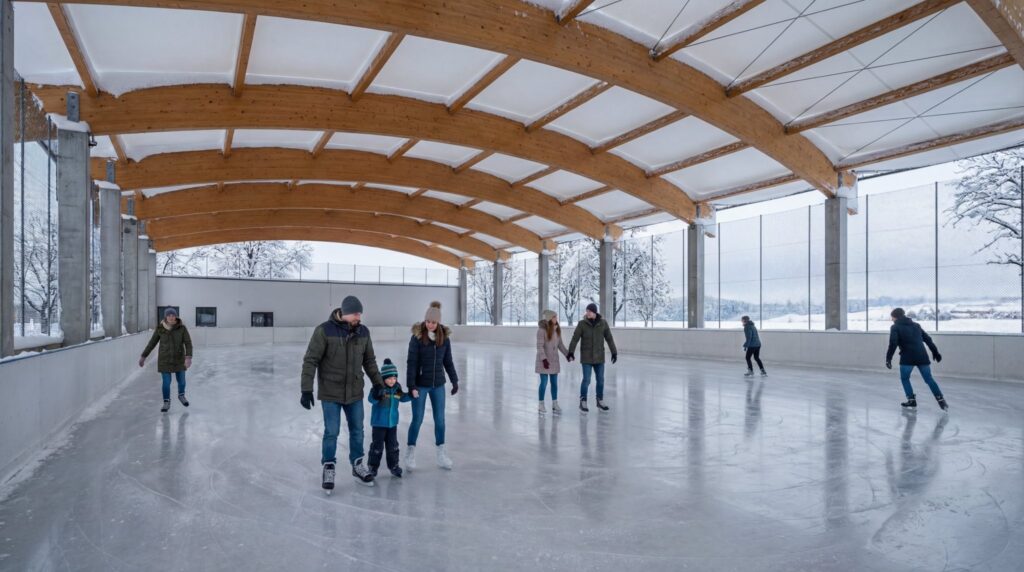 Zadaszona tafla z profesjonalnym agregatem chłodniczym w sezonie zimowym będzie funkcjonować jako lodowisko, natomiast latem jako kort tenisowy ze sztuczną nawierzchnią, co zapewni efektywne, całoroczne wykorzystanie obiektu.